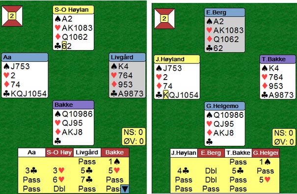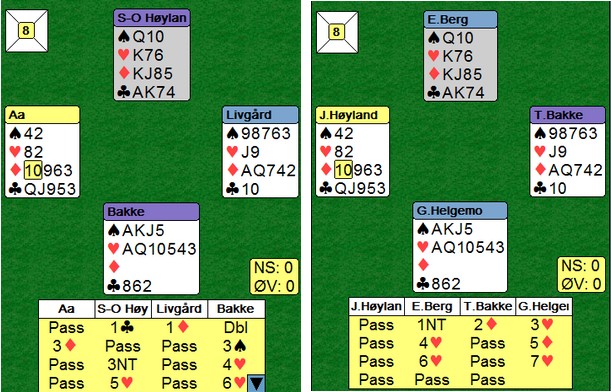 Øyvind Saur fikk sparkongen ut til esset. Han fortsatte med ruter til bordet og kløver til kongen (!). Han tenkte sikkert slik at hvis en var kort i kløver, var det sikkert syd som hoppet til 3sp. Nå kunne ikke 3NT vinnes lenger. På det andre bordet la Glenn Grøtheim ned kløveresset tidlig og da spilte resten seg selv. D10xx kunne fanges opp og en hjerter forsvant på ruteren. Hjerteresset satt foran kongen og +920. Den scoren tror jeg ikke mange slår.