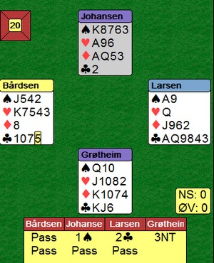 Glenn spiller ut hjerter 2 og finner makkers farge. Syd stikker og bommer ruteren, noe som ser naturlig ut. Mer hjerter som syd vinner. Han tar tre ruterstikk og spille kløver til knekten. På de to ruterne, kasta Lars Arthur to kløvere og har med det latt makker i stikken med holdet i begge svartfargene. Det kunne vært kritisk, men ikke når du har sånn oversikt som nordlendingen. I posisjonen over til høyre, tar han for hjerter 10, men IKKE hjerter knekt !!