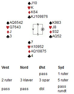 Thomas åpnet i 1 spar i Syd, og fikk 1NT fra makker. Nå meldte han 2NT som utgangskrav (noe hardt, men helt akseptabelt) og Thor-Erik viste frem 5+ hjerter med 3 ruter. Nå ville ikke Thomas vise frem den tynne sparfargen med 3 spar, så han meldte 3NT. Nå tok det helt av for Thor-Erik som trodde makker hadde en 5431-hånd (med singel hjerter, siden de melder 3 hjerter over 3 ruter med 2+ hjerter). Dersom 4 kortsfargen er i kløver håpet han det stod slem.