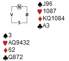 Inne på ruteresset spilte jeg mer hjerter. Syd prøvde tieren siden utspillet kunne være fra 98x. Vest vant og fortsatte med ruter. Nå gikk ikke kappen mer. Damen min vant og så låste jeg spillefører i bordet i ruter. EK i kløver og Boye fikk for både tieren og damen.