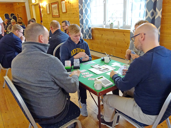 Stilig med bridgebord over heile salen. Gunnveig Wetteland var ein av dei som var tidleg på plass.Takk til Austevoll BK for lånet og god hjelp.