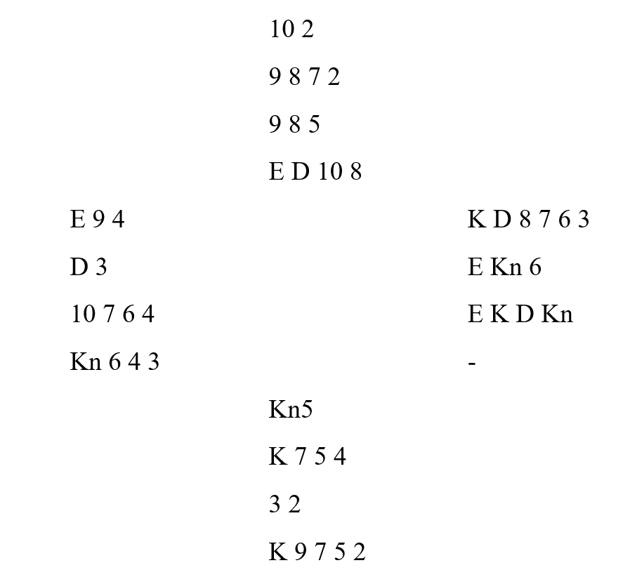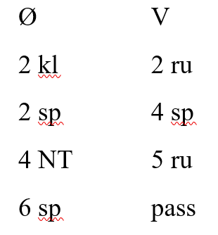 Kontrakten var 3 NT, og utspillet kløver ti til kongen. Sparknekt fikk beholde stikket, men en liten spar måtte Nord ta med kongen. Nå var det ikke lenger noe inntak til kløverne, og Nord skiftet til hjerter til esset og mer hjerter til kongen. Når jeg nå tok de svarte stikkene, måtte Syd gå ned til dobbel hjerter og ruter konge dobbel. Hjerter dame og mer hjerter spilte han inn, og ruteroppspillet i saksen ga 10 stikk og 10 plusspoeng.