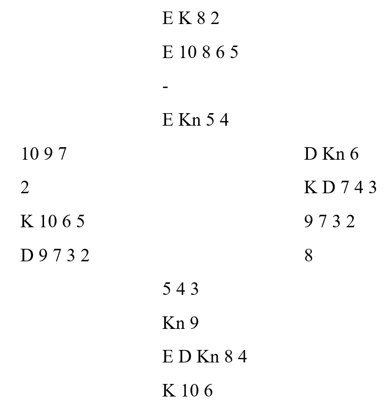 Her har spillefører informasjon, østs åpning. Uten A-K i hjerter hos øst blir det knapt en åpnngshånd, så Ann-Mari spilte på J-9-x i hjerter hos vest (eller J-9 dobbel hvis nieren kommer på). Hun stakk den utspilte ruteren med esset og spilte liten hjerter til fireeren og femmeren! Men øst hadde nieren som hun stakk med før hun fortsatte med ruter. Den ble stukket med damen, så spar til damen og nok en hjerter mot nord til knekt, dame og honnør. Øst tok det tredje hjerterstikket sitt og spilte kløver, men kløverskiftet kom litt for sent til å skape trøbbel. Kløver ess vant stikket, så to store ruter med sparavkast fulgt av spar til stjeling. Siden den fargen satt 3-3 var det med tre sparstikk i alt ti stikk. Dermed ble det en "fet" +620 til notering etter på en måte å ha gjort blindemann (syd) til hovedhånd.