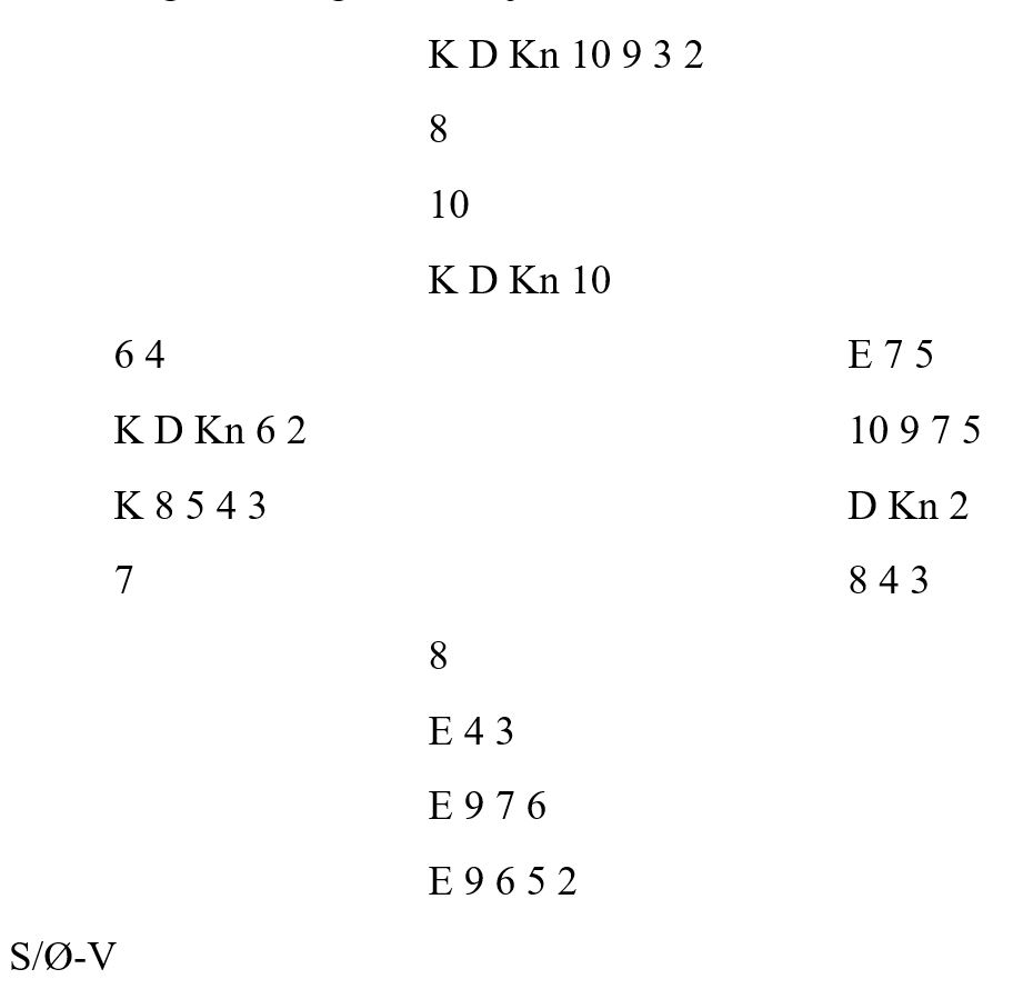 Hun tok for den siste trumfen hos syd og stakk ikke over. Da likte hun kanskje ikke helt at begge fulgte slik at trumfen satt 3-2, for nå måtte hun altså spille seg hjem i spar. Og sparen satt 6-1! Men heldigvis hadde ikke vest som hadde singel spar fra start den siste trumfen. Så inne på spar konge fikk hun tatt ut østs tredje trumf og kunne kaste to ruter på spar etterpå, +1430.