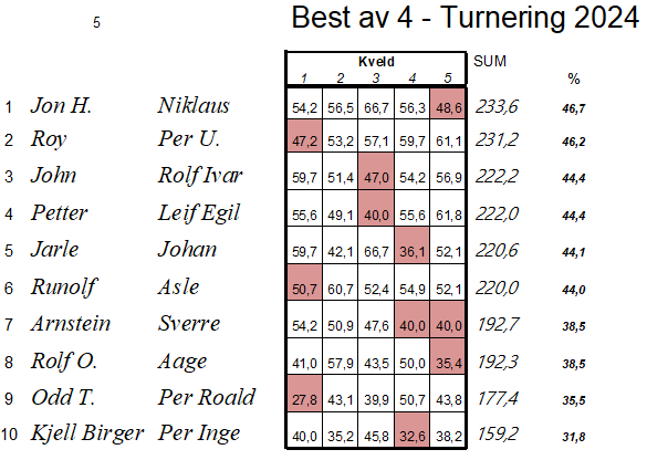 Søndag ble det spilt lagturnering i Trondheim. På vinnerlaget spilte Kåre Bogø, Geir Helgemo, Erik Berg og Ove Andersbakken. Hele resultatlisten finner du her.